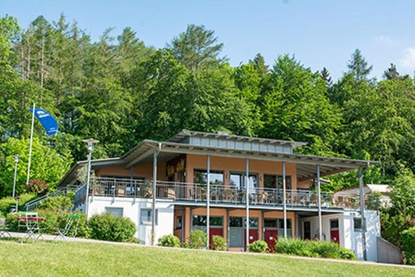 Seebad am Campingplatz Utting mit Café/Restaurant. In unmittelbarer Nähe befindet sich das Labyrinth Ex Ornamentis und der Hochseilgarten Ammersee
