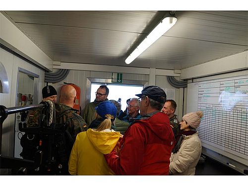 Wer öfters am Starnberger See ist, kennt das Floß mit dem Haus drauf, das Sommer wie Winter beinahe täglich auf dem Wasser schwimmt: Die Tauchinsel der Bundeswehr - näher als 50m darf da keiner ran. An Land militärisches Sperrgebiet umzäunt mit Stacheldraht: Zivilpersonen ist der Zutritt zum Gelände direkt am See und mit sensationellem Zugspitzblick verboten, doch am 10. April 2019 öffnete Hauptmann Stefan Kühlmann die Schranke für die rund 30 TeilnehmerInnen der Führung aus der Reihe Region | Wasser | Identität. Im Vorfeld waren die Plätze für den Besuch bereits kurz nach der Ankündigung ausgebucht, die einhellige Meinung: es hat sich absolut gelohnt, denn das Team gab jede Menge spannende Einblicke in die tägliche Arbeit der Bundeswehr – über und unter Wasser.
