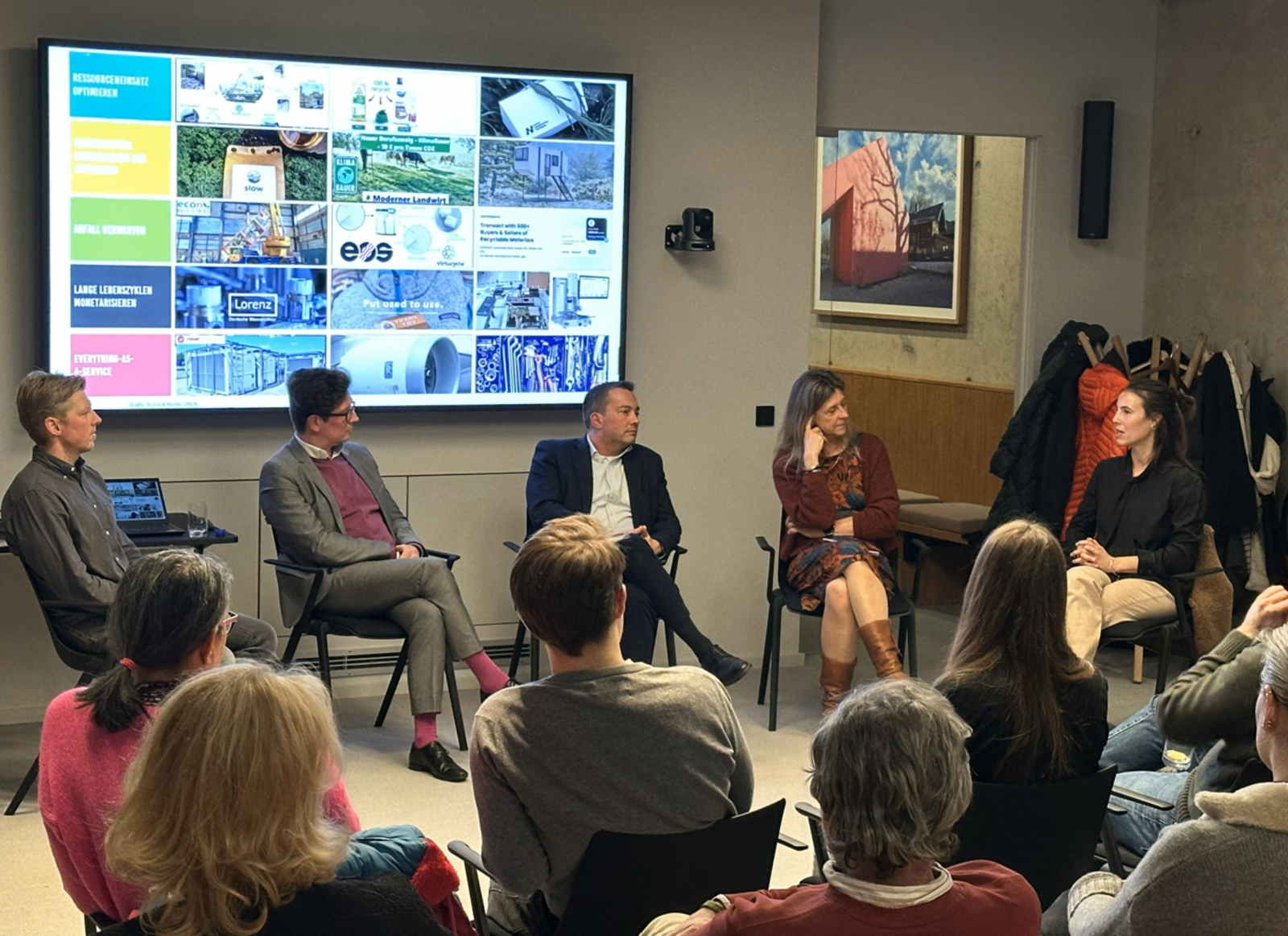 In der anschließenden Diskussion zeigten drei Teilnehmer:innen aus dem Landkreis, wie es gehen kann: Wie kann man heute als Architektin noch guten Gewissens und im Einklang mit der Natur Häuser bauen? Inwiefern sind Produkte aus dem 3D-Drucker ein Rezept gegen Überproduktion oder lange Transportwege? Wie gelingt es elektronische Bauteile wiederzuverwenden und so wertvolle Rohstoffe zu sparen? Ein ganz großes Dankeschön an Antonia Cruel, Björn Hannappel und Stefan Theil, die den Abend sehr bereichert haben!